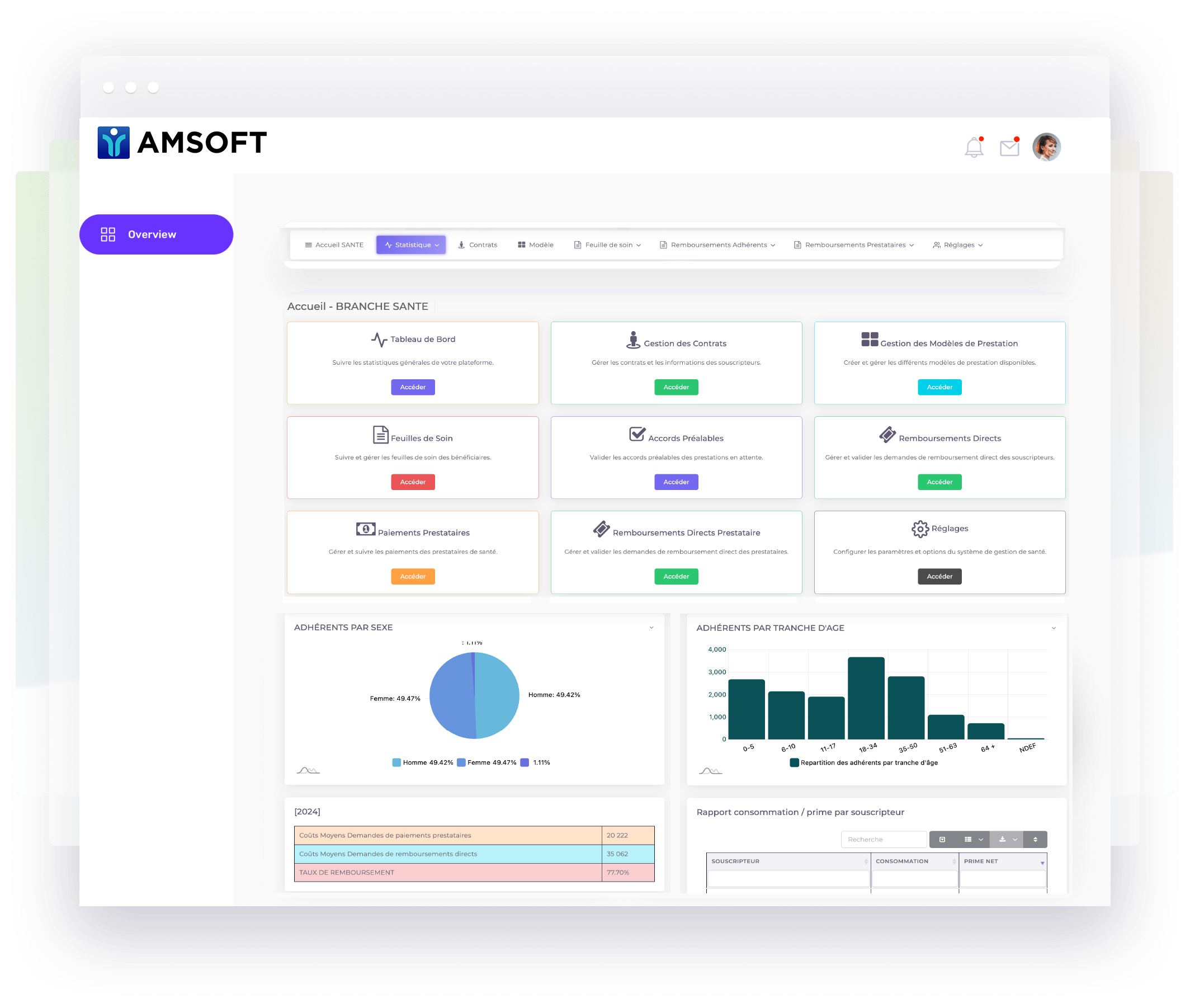 Connecté, cohérent et conforme aux normes CIMA, AMSOFT devient le cœur de votre système d’information — une solution unique, puissante et harmonisée pour gérer, analyser et faire croître votre compagnie d’assurance.